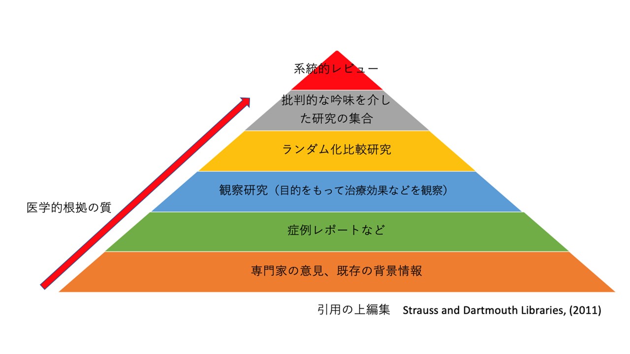 批判的吟味(critical appraisal)という言葉を聞いたことがある方もおられると思います。医学では、入手した医学的、科学的根拠の結果を鵜呑みにするのではなく、傾向、先入観、データの偏り、個人の思考や思い込みから生じる情報の偏りに起因する「歪み」がないかを判断するためのプロセスのことを言います。我々医療従事者は日々の臨床業務の傍ら、新しい研究や論文をこの批判的吟味というフィルターを介することで理解し、臨床業務に役立てます。そして最終的には、図のような根拠の質のヒエラルキーを考え診療や治療方針を決定するわけです。詳しくはぜひ検索エンジンでご確認いただきたいと思います。